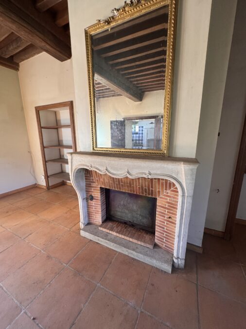 - un salon lumineux de 33,45 m² environ, avec deux accès, l’un sur la rue et l’autre directement sur le terrain, une cheminée non fonctionnelle et un poêle à bois a priori non tubé