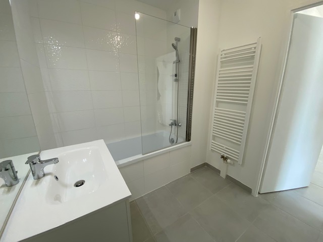 Une salle de bain avec baignoire et pare douche. L’entrée est équipée d’un digicode, ouvre porte et un thermostat de chauffage. Un dégagement desservant deux chambres avec sol en parquet ( respectivement de 12,77 m2 et 9,65m2).
